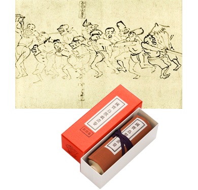 ウサギとカエルの相撲、追いかけっこをするサル。遊び、飛び跳ねる躍動的な動物たち。日本絵画史の一大傑作として知られ、誰もが愛する絵巻「国宝 鳥獣人物戯画」全四巻。その全てをコロタイプ刷の縮小絵巻物に仕立てました。ストーリーを追って楽しむもよし、お気に入りの場面を広げてインテリアとするもよし。海外へのギフトにも最適な一品です。
