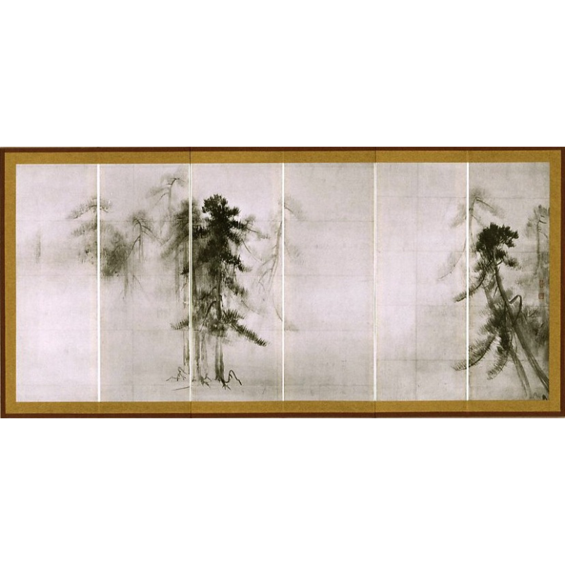 本図は等伯が牧谿(南宋の画人)の画風にならい描いたもので、毛筆のほかに藁筆なども用い、煙雨に霞む松林の景観を大画面に水墨一色で描き表しています。その簡潔な構図や鋭い筆致、巧みな墨色の変化などの新鮮な表現は、桃山時代の新感覚を示すものです。等伯の代表作で、近世水墨画の最高傑作です。自らの理想は「静かなる絵」とした等伯の「松林図屏風」は、観るものを禅の境地へいざないます。それ故に本作品は海外での人気が高く、海外への贈り物や手土産にも非常に人気の高い商品です。