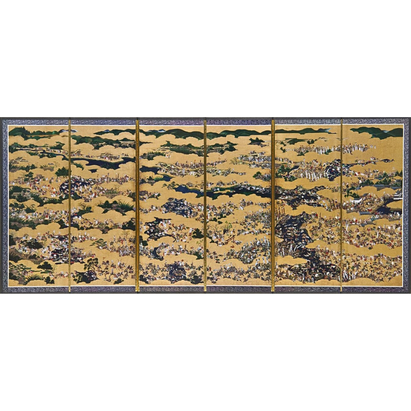 元和元年(1615)に起こった大坂夏の陣、とくに5月7日の決戦を描いた屏風です。この屏風は戦に参戦した黒田長政(黒田官兵衛の息子)が生前に描かせたもので、福岡藩黒田家に伝来しました。特徴的なのは、武将達の勇猛果敢ぶりだけでなく、逃げ惑う大坂城下の人々の姿が克明に描かれている点です。単なる戦勝記念ではない長政の気持ちが伺えます。