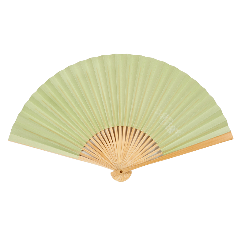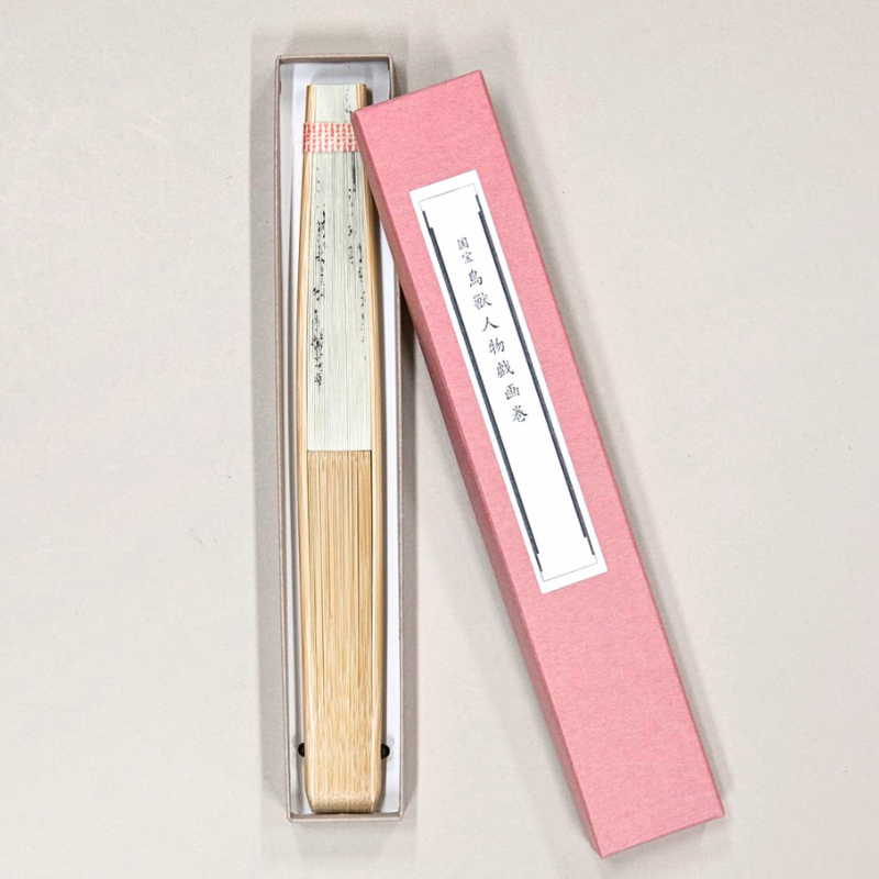 白の紙地に絵巻の代表的なシーンを品よくあしらいました。裏面の若草色が白竹が爽やかな女性用扇子です。実用としてはもちろん、飾り扇子としても、また贈答にも大変喜ばれる逸品です。