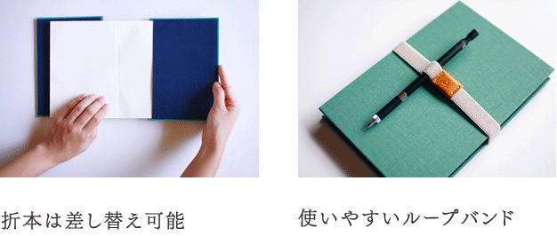 | 仕様 | クロス貼差し込み式カバー(空押し有) リフィル(折本ノート朱印帖タイプ 50頁) ループバンド付 専用化粧箱入 |