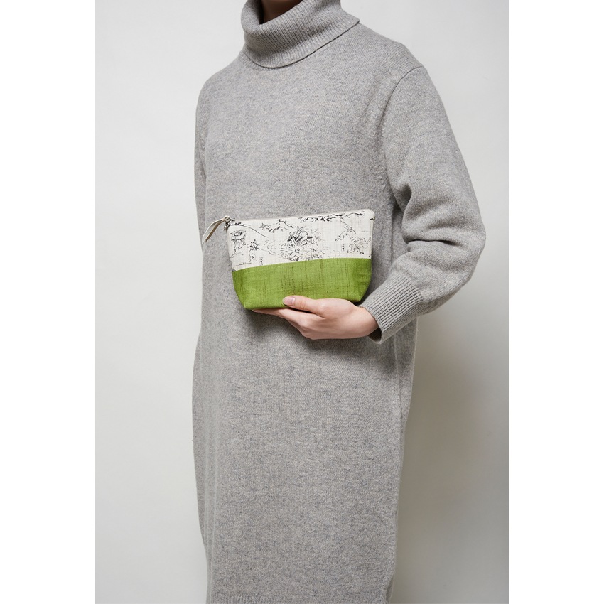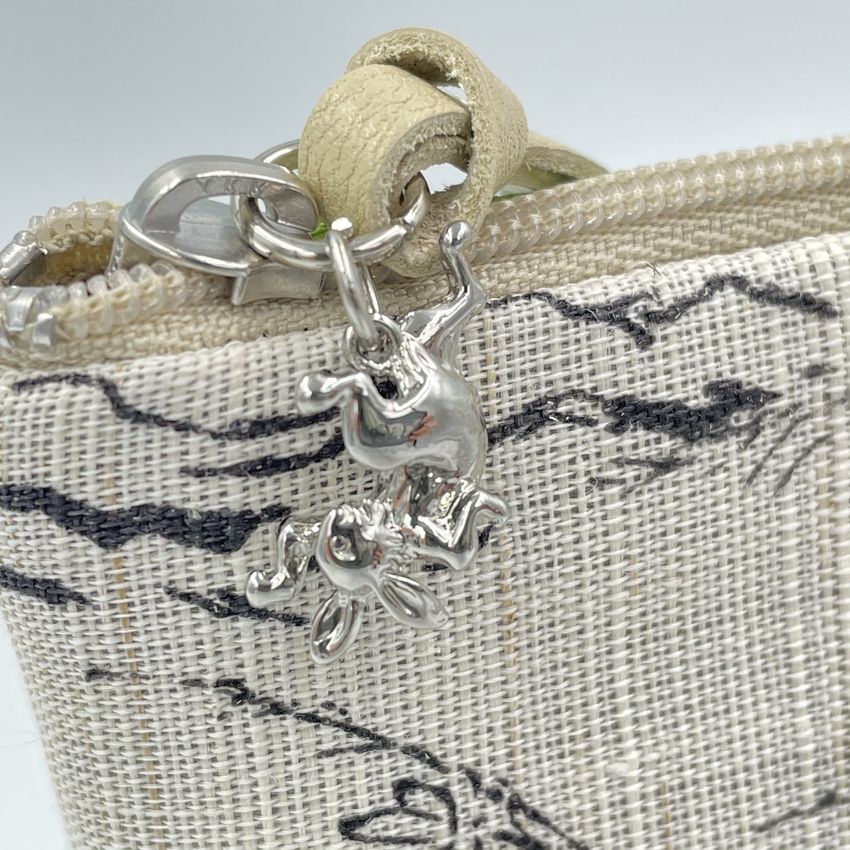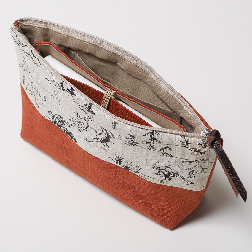 ユーモラスな動物たちが、味わいのある生地を彩ります。巻物の雰囲気を残した、シンプルながら目を引くデザイン。細かいものを入れるのに便利な内ポケットも付けました。兎の銀チャームも可愛らしく、プレゼント用にもご自分用にもぴったりです。