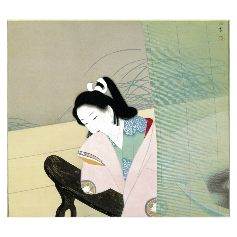 明治8~昭和24年(1875~1949)、京都生まれ。京都画壇を代表する美人画家として活躍しました。京風俗や古典文学をモチーフに、気高くたおやかな女性を数多く描きます。1948年に女性初の文化勲章を受章しました。子の上村松篁、孫の上村淳之と三代にわたって日本画家として活躍します。代表作は《重文 母子》《重文 序の舞》など。