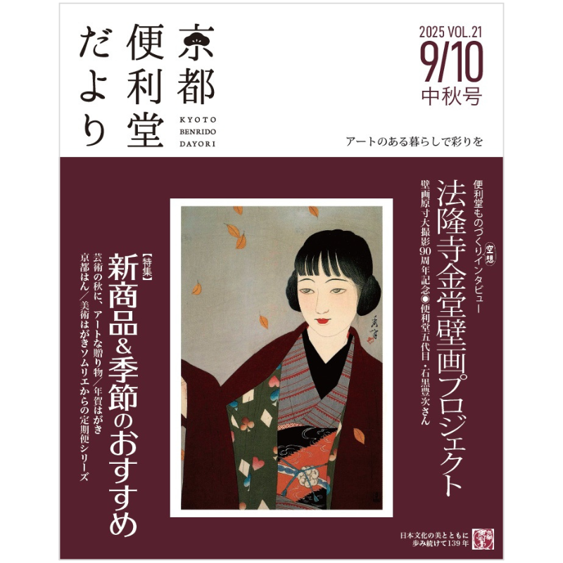 「アートのある暮らしで彩りを」をコンセプトに、美術商品と暮らす生活をご提案するフリーペーパーです。 隔月1冊のペースで発行し、季節ごとのオススメ商品や便利堂のこだわりを1冊にまとめてご紹介しています。 オンラインショップで商品をご購入いただきますと、最新号を商品と同梱発送いたします。