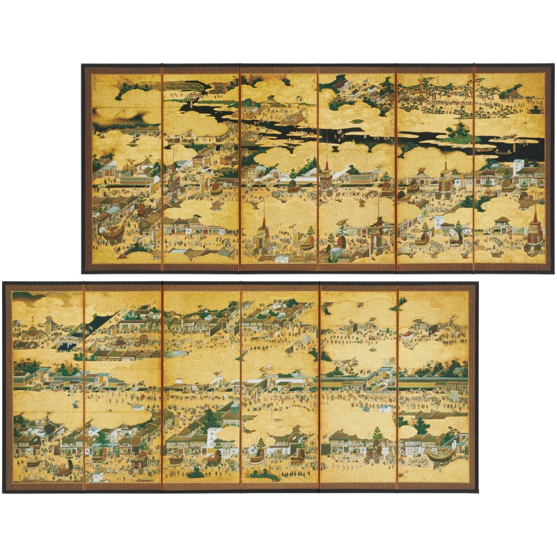 右隻には前祭、左隻には後祭が描かれ、いずれも江戸時代の祭りの様子が緻密に表現されています。