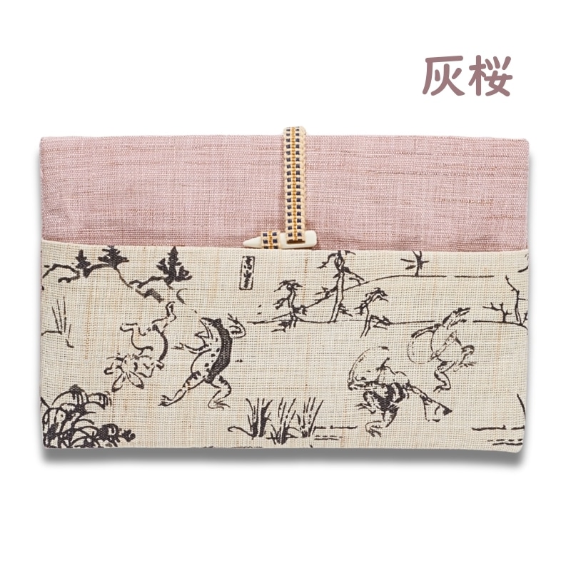 ユーモラスな動物たちが、味わいのある生地を彩ります。巻物の雰囲気を残した、シンプルながら目を引くデザイン。真田紐とコハゼで留める和のあしらいが素敵です。外側にもポケットがあり、小物を入れる事が可能です。通帳やパスポート、スマートフォンも入るサイズなので、幅広く使っていただけます。プレゼント用にもご自分用にもぴったりです。