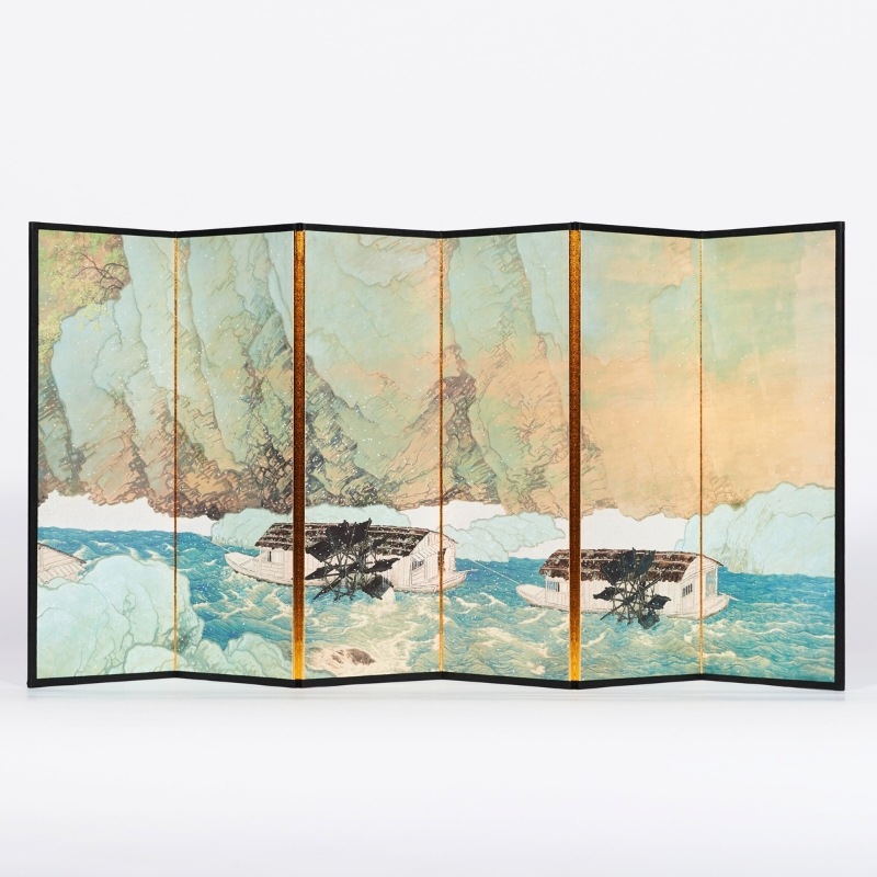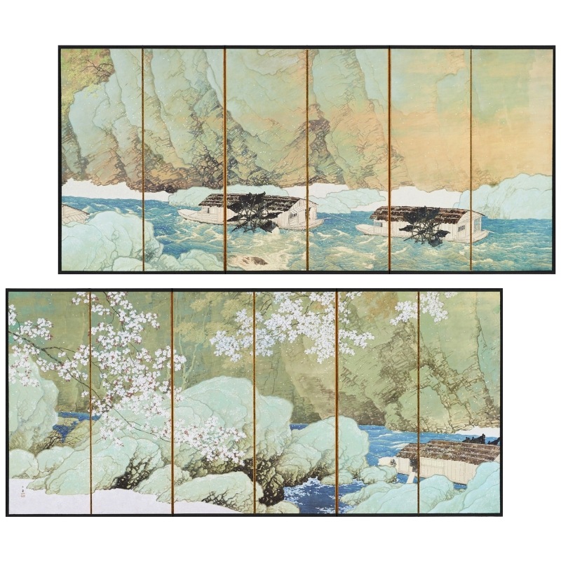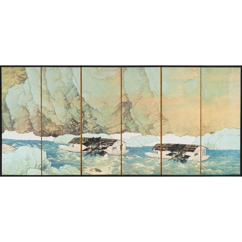 繰り返し同じリズムでまわる水車に特に興味を覚えた玉堂は、その動きを伝えようと、勢いよく水が流れるさまを表現するのに最も苦心したといいます。自然の雄大さと季節の移ろいが見せる繊細さ、そうした自然の多様な表情とそこに生きる人々の生活とを結びつけながら、詩情豊かな世界を描き出しています。