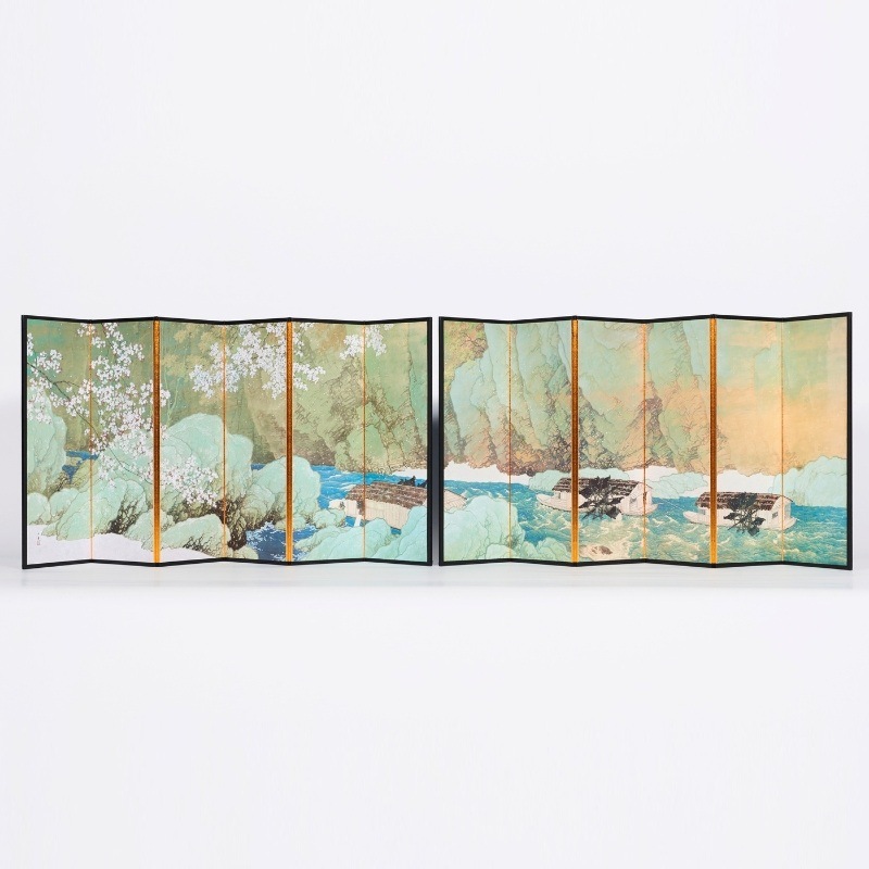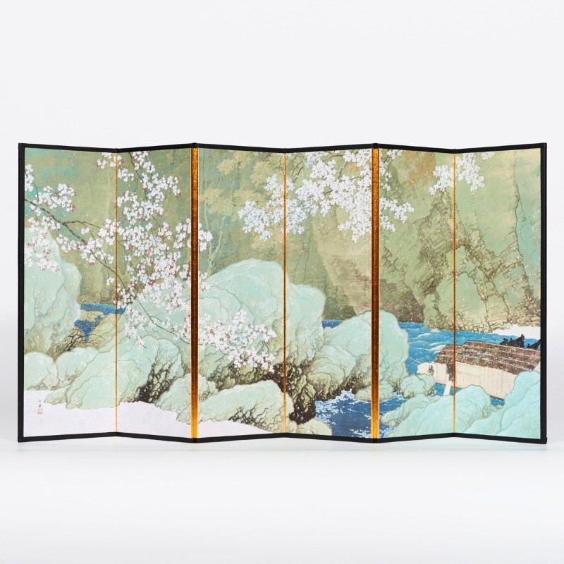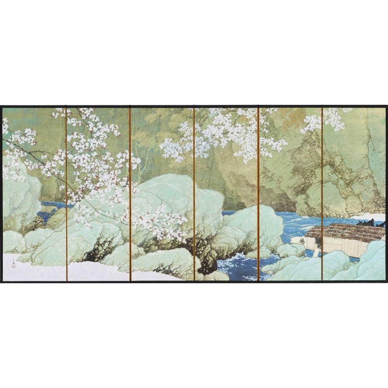 秩父の長瀞の光景を描いた本作品。玉堂は制作の前年秋と同年早春に長瀞にスケッチ旅行に訪れて川下りを楽しんでおり、その時の風景を出発点として、小雪のように舞う桜をあしらったのが、この《行く春》です。
